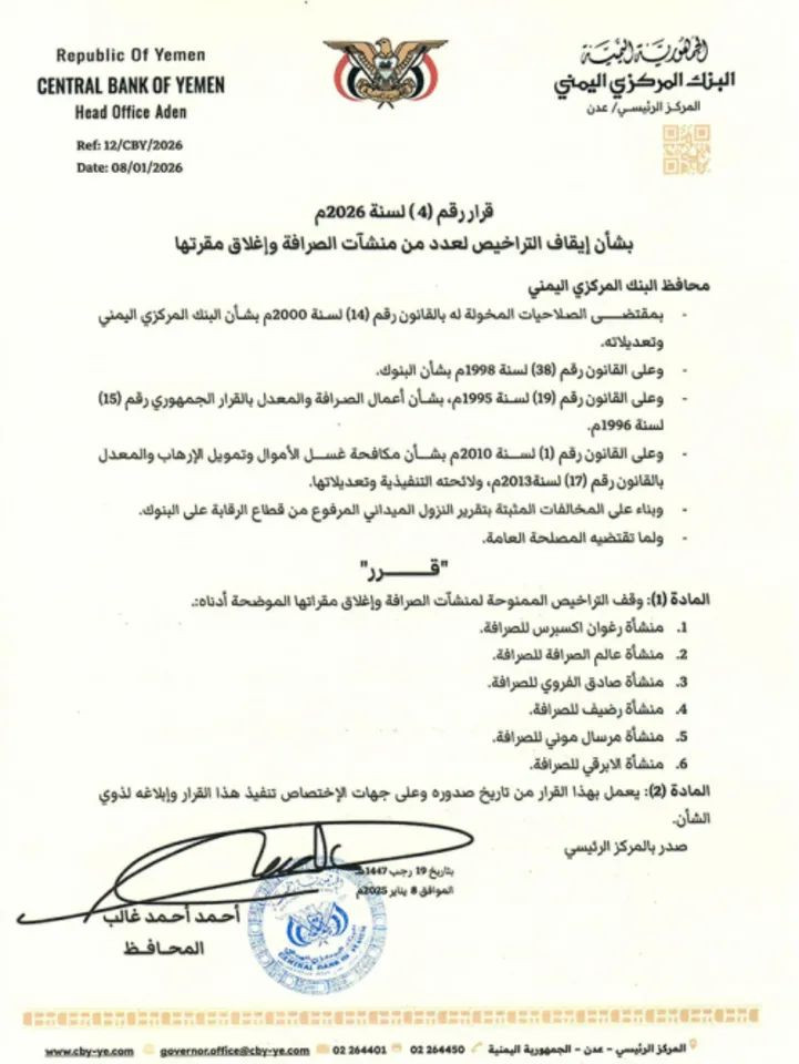 كما نص القرار رقم (4) لعام 2026م، بإيقاف التراخيص الممنوحة لعدد من منشآت الصرافة المخالفة، وإغلاق مقراتها، وذلك بعد ثبوت مخالفاتها وفقًا لتقرير قطاع الرقابة على البنوك.