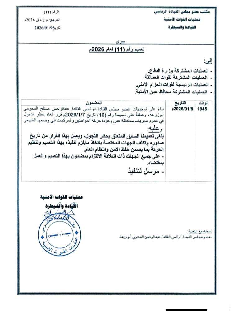ونص التعميم على إلغاء العمل بالقرار السابق رقم (10) لعام 2026م بشأن حظر التجوال، ووجه الجهات المختصة والمعنية بمباشرة مهامها لتنظيم الحركة بما يضمن استدامة الأمن والنظام العام وتسهيل تنقلات المواطنين.