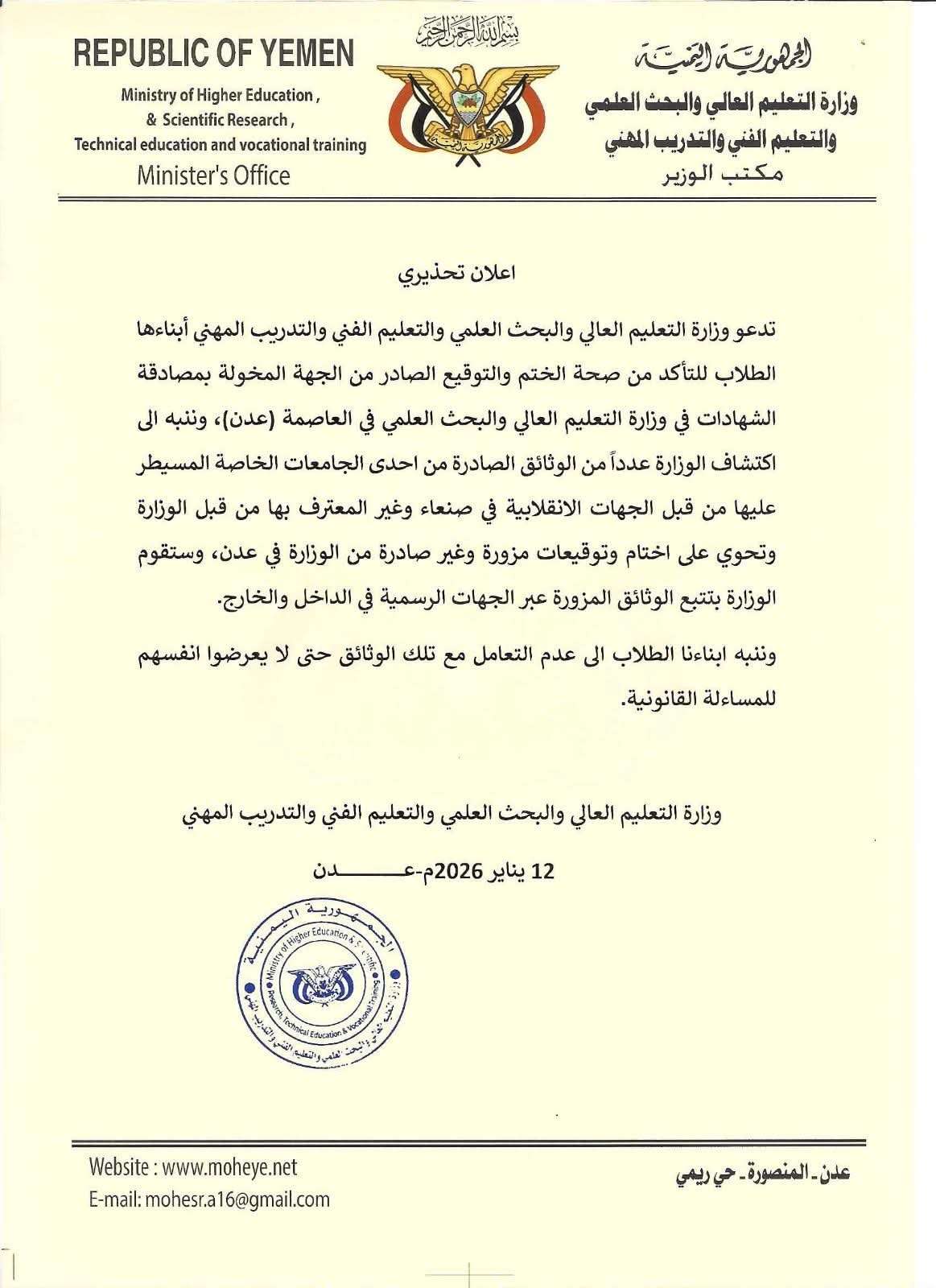 حذّرت وزارة التعليم العالي والبحث العلمي والتعليم الفني والتدريب المهني الطلاب من التعامل مع وثائق وشهادات دراسية مزورة، داعية إلى التأكد من صحة الأختام والتواقيع الصادرة عن الجهة المختصة بالوزارة في العاصمة المؤقتة عدن.