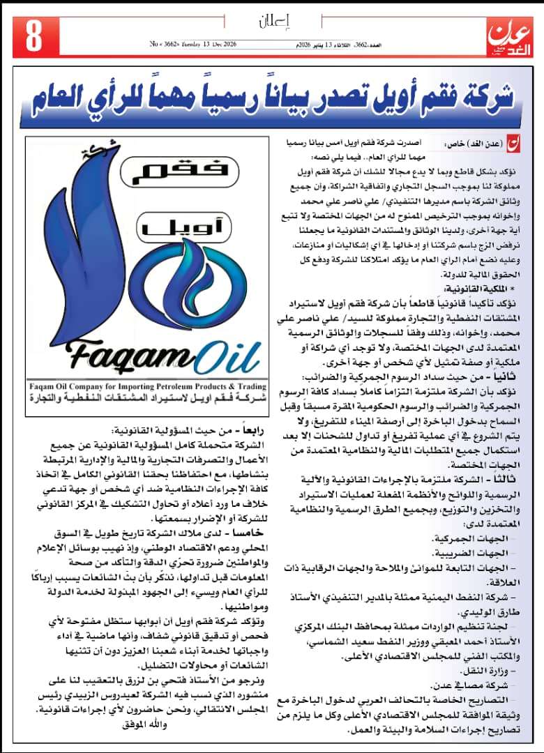 نؤكد تأكيداً قانونياً قاطعاً بأن شركة فقم أويل لاستيراد المشتقات النفطية والتجارة مملوكة للسيد/ علي ناصر علي محمد، وإخوانه، وذلك وفقاً للسجلات والوثائق الرسمية المعتمدة لدى الجهات المختصة، ولا توجد أي شراكة أو ملكية أو صفة تمثيل لأي شخص أو جهة أخرى.