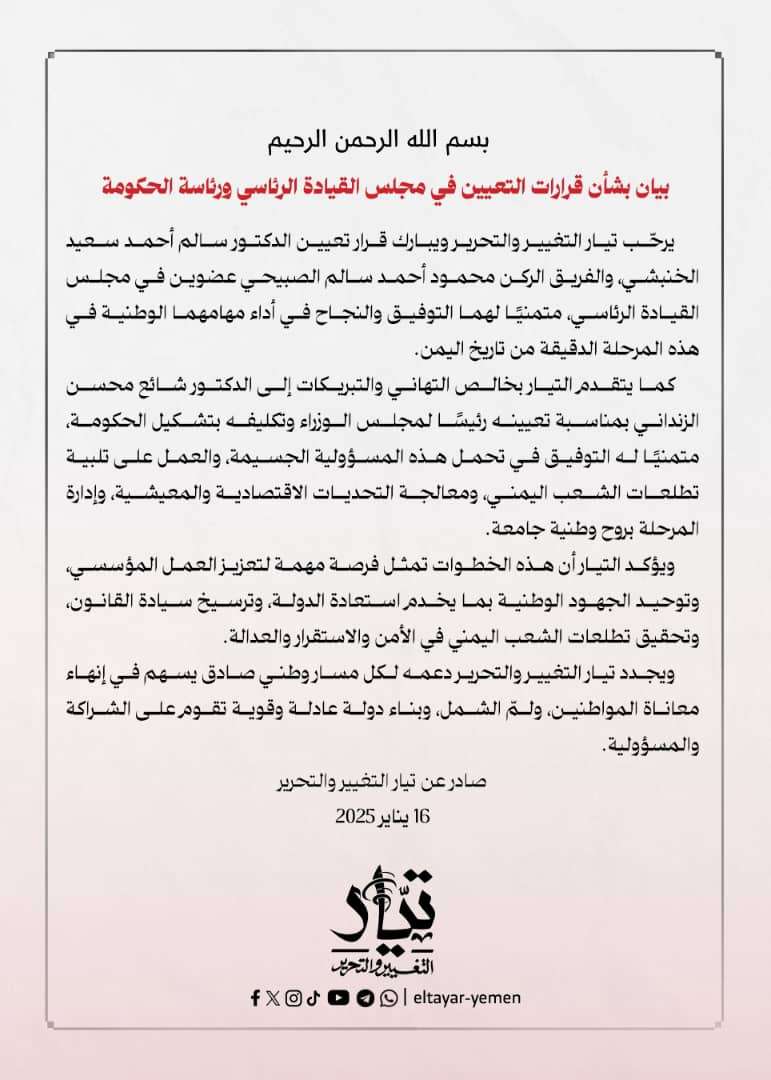 ويجدد تيار التغيير والتحرير دعمه المسارات الوطنية التي تسهم في إنهاء معاناة المواطنين، وبناء دولة عادلة قائمة على الشراكة والمسؤولية.