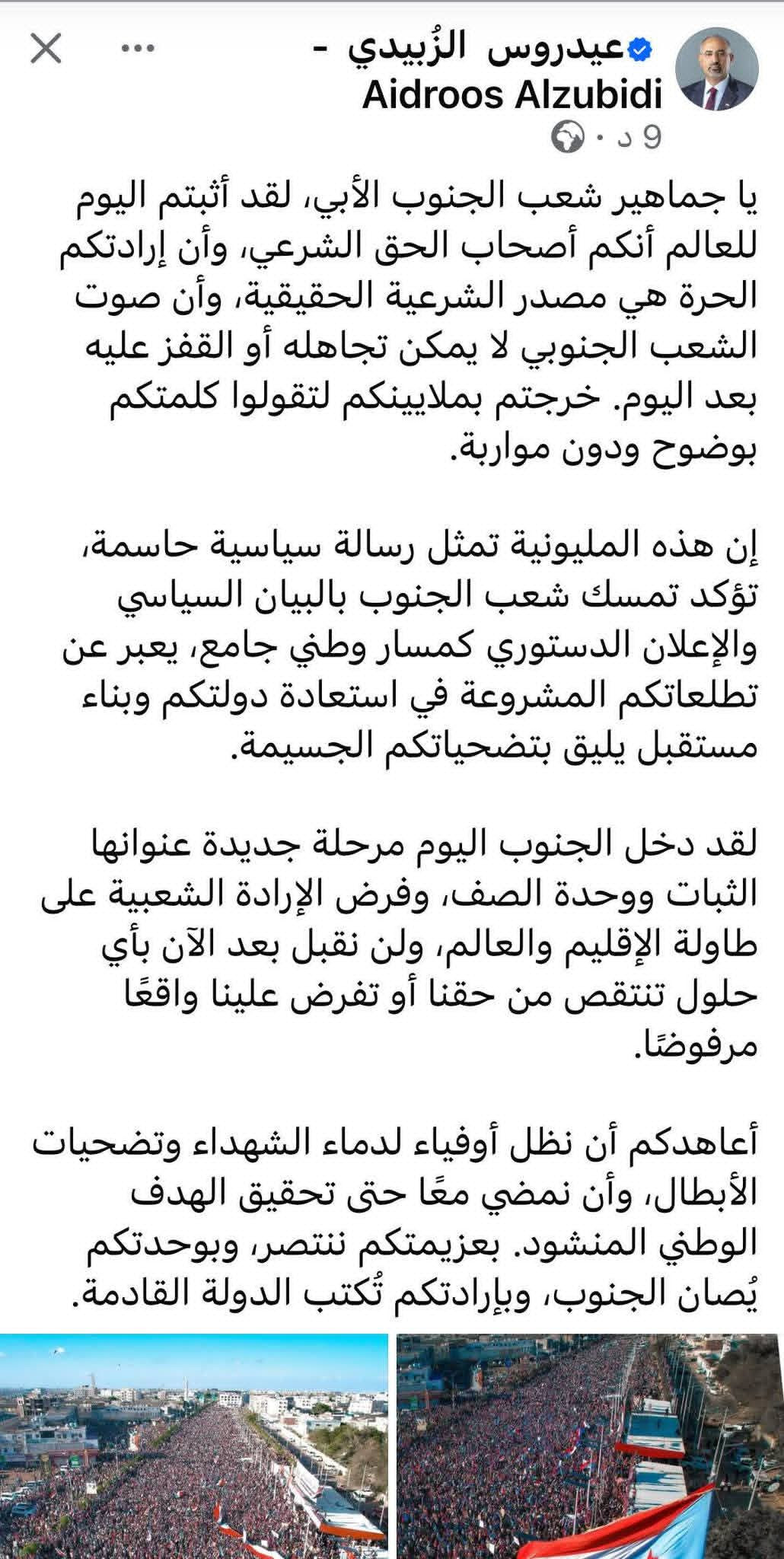 وجّه الرئيس القائد عيدروس قاسم الزُبيدي رسالة إلى أبناء الجنوب عبر صفحته على فيسبوك، أشاد فيها بالحشود المليونية، مؤكدًا أنها عبّرت عن الإرادة الحرة والحق المشروع للشعب الجنوبي.