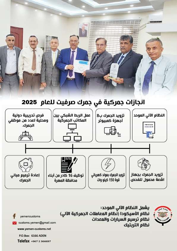 اولت رئاسة مصلحة الجمارك اهتماما كبيرا لتطوير جمرك صرفيت بمحافظة المهرة خلال العام المنصرم 2025، حيث شملت هذه الجهود مسارات التحديث والتطوير المؤسسي، مسهمة في إحداث نقلة نوعية في أداء المنفذ خلال العام الماضي.