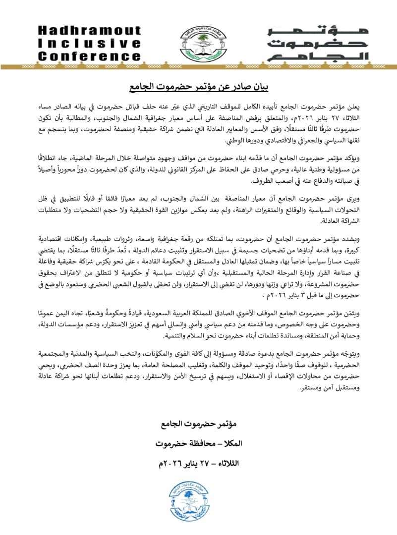 يعلن مؤتمر حضرموت الجامع تأييده الكامل للموقف التاريخي الذي عبّر عنه حلف قبائل حضرموت في بيانه الصادر مساء الثلاثاء 27 يناير 2026م، والمتعلق برفض المناصفة على أساس معيار جغرافية الشمال والجنوب، والمطالبة بأن تكون حضرموت طرفًا ثالثًا مستقلًا، وفق الأسس والمعايير العادلة التي تضمن شراكة حقيقية ومنصفة لحضرموت، وبما ينسجم مع ثقلها السياسي والجغرافي والاقتصادي ودورها الوطني.