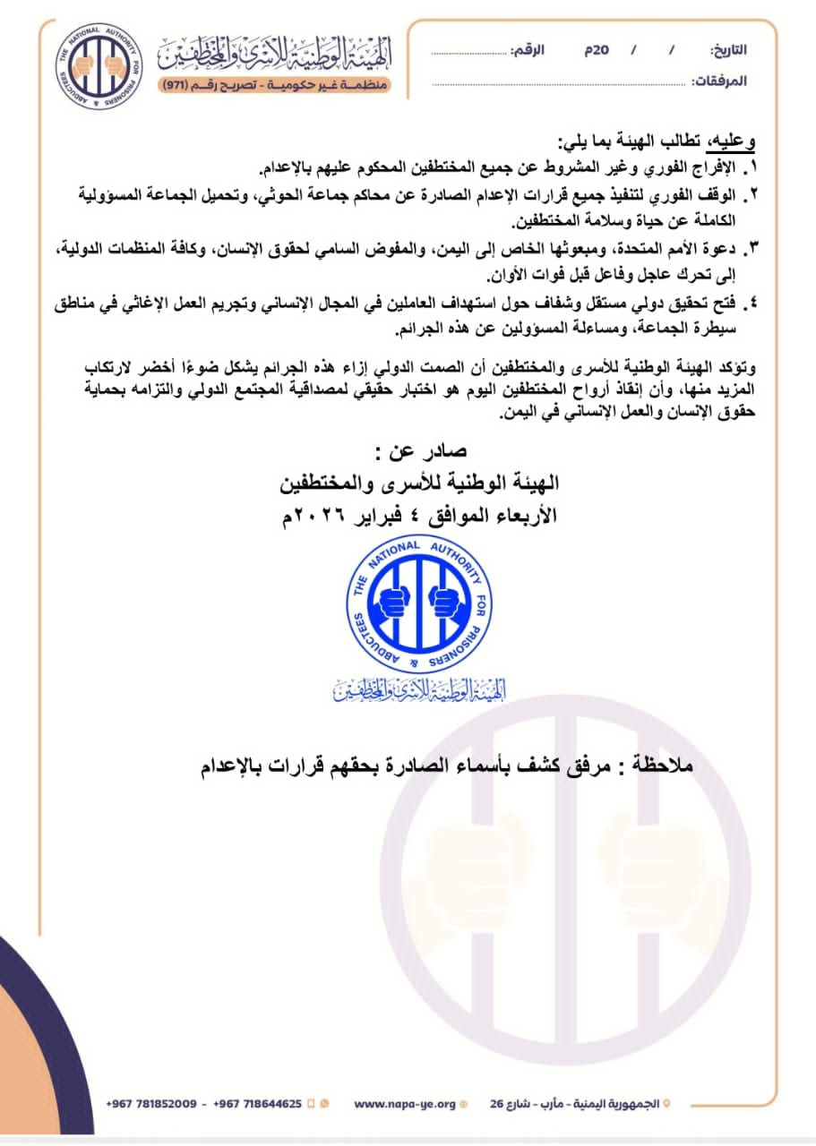 أدانت الهيئة الوطنية للأسرى والمختطفين، وأعربت عن بالغ استنكارها لما وصفته بـ"قرارات الإعدام الجائرة" الصادرة عن جماعة الحوثي المسلحة بحق 32 مختطفًا، بينهم عاملون في منظمات دولية وإنسانية وموظفون في السفارة الأمريكية، معتبرةً ذلك "سابقة خطيرة" تكشف نهج الجماعة القائم على توظيف القضاء كأداة انتقام وتصفية سياسية ممنهجة.