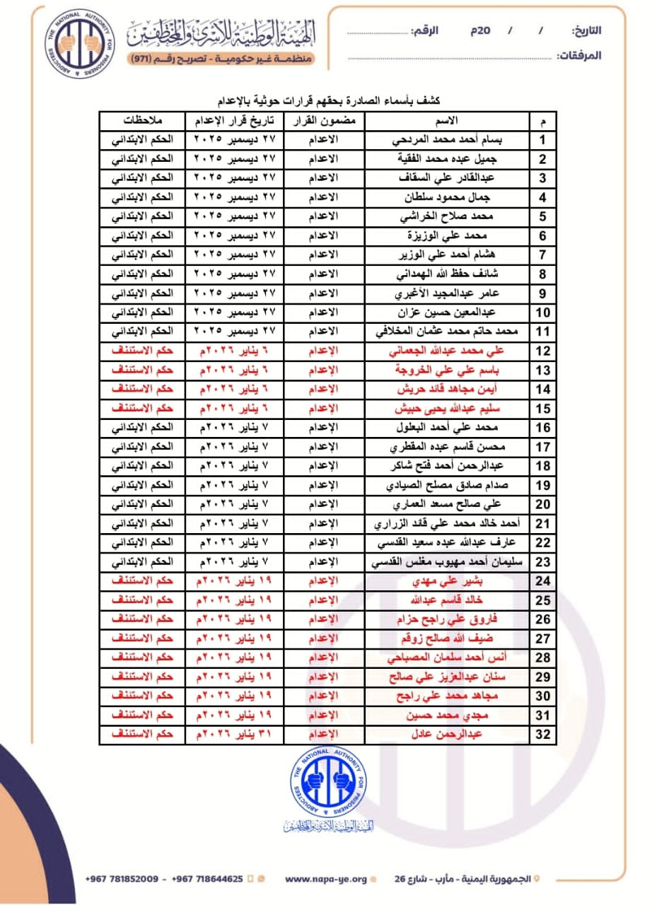 وأشار البيان إلى أن مجمل المؤشرات، وفي مقدمتها التحريض العلني والتسارع غير الطبيعي في تثبيت الأحكام وتزامن ذلك مع التصعيد السياسي والعسكري، تؤكد أن جماعة الحوثي "تُحضّر لمذبحة جديدة ووشيكة"، باستخدام أحكام الإعدام كوسيلة ترهيب جماعي ورسائل سياسية، في تحدٍ سافر للمجتمع الدولي ولكافة الجهود الإنسانية.