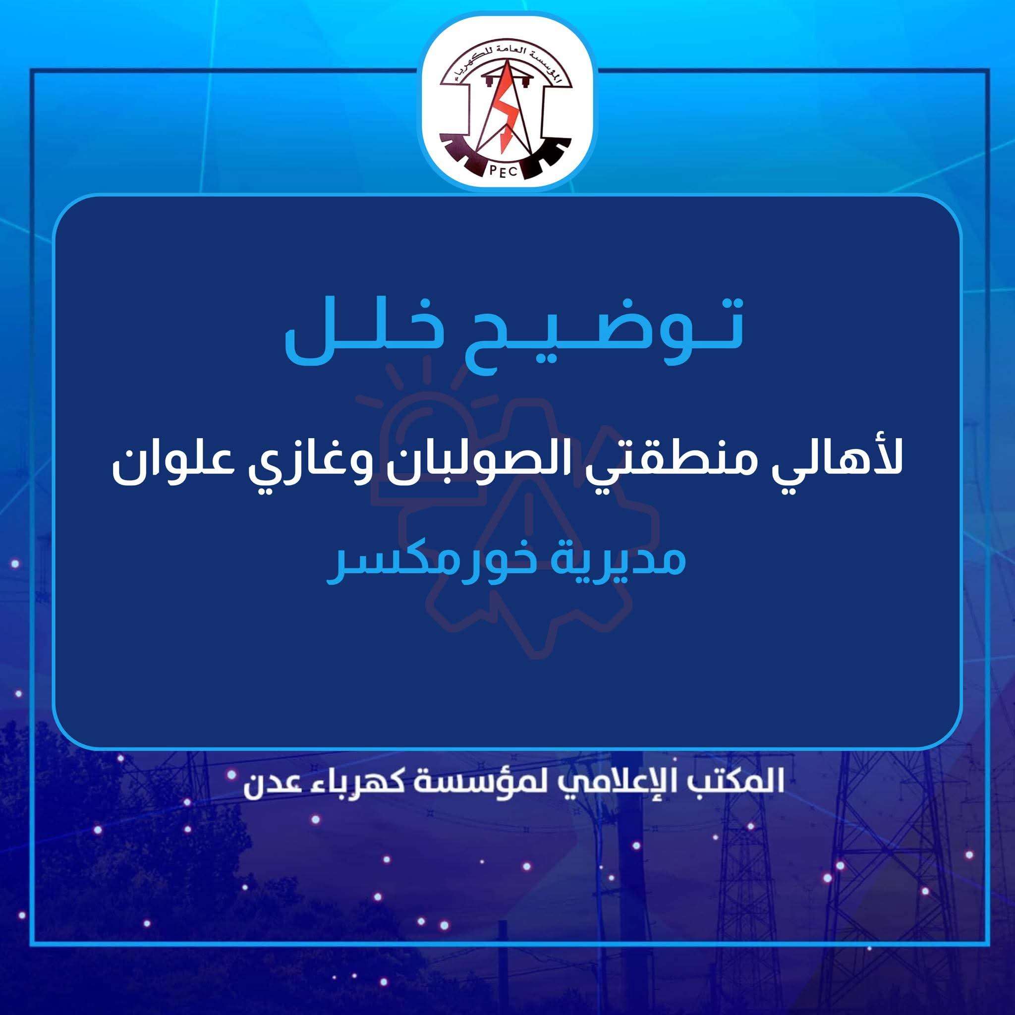 كهرباء عدن توضح سبب انقطاع التيار عن الصولبان وغازي علوان