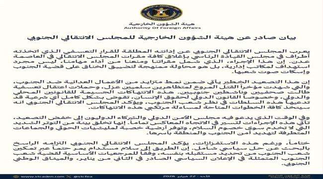 وأكدت هيئة المجلس الانتقالي في بيان" أن هذا الإجراء لا يندرج ضمن إطار إداري، بل يأتي في سياق نمط متزايد من الأعمال العدائية التي طالت المتظاهرين السلميين، إلى جانب حملات الاعتقال التعسفية التي استهدفت صحفيين وناشطين جنوبيين، في انتهاك صارخ للقوانين المحلية والدولية، وخاصة ما يتعلق بحقوق الإنسان.