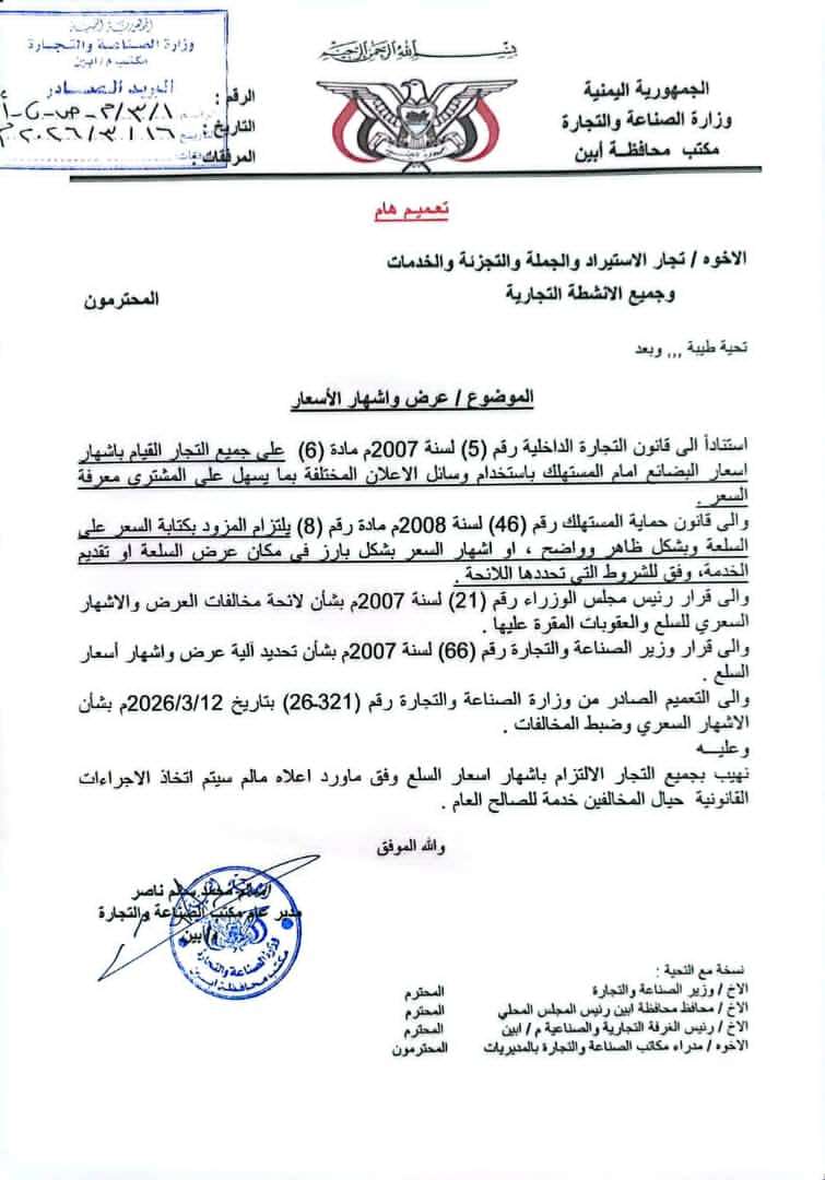 أصدر مكتب وزارة الصناعة والتجارة محافظة أبين بقيادة الاستاذ سالم المعلم تعميماً هاماً موجهاً إلى كافة تجار الاستيراد والجملة والتجزئة ومقدمي الخدمات، يقضي بضرورة الالتزام بعرض وإشهار أسعار السلع والخدمات بشكل واضح أمام المستهلك.