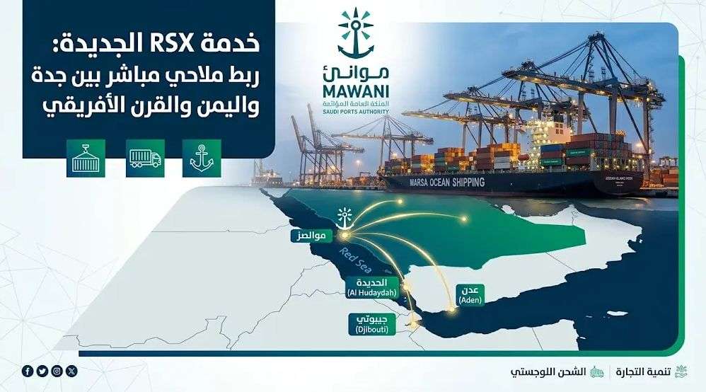 أعلنت الهيئة العامة للموانئ السعودية "موانئ" إضافة خدمة الشحن الجديدة "RSX" إلى ميناء جدة الإسلامي، ضمن مسار ملاحي يربط ميناء عدن بعدد من موانئ البحر الأحمر وخليج عدن، بينها الحديدة وجيبوتي.