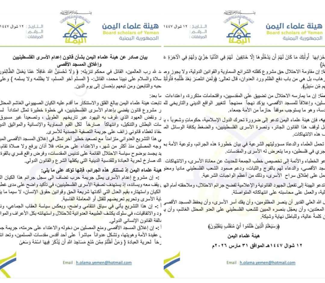 بيان صادر عن هيئة علماء #اليمن بشأن قانون إعدام الأسرى #الفلسطينيين وإغلاق #المسجد_الأقصى