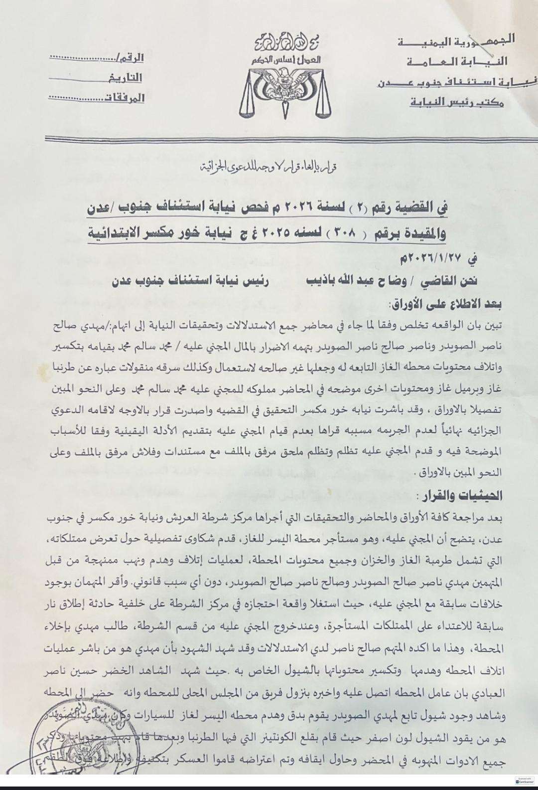 وجّهت نيابة جنوب عدن، برئاسة القاضي وضاح باذيب، بضبط المتهمين في واقعة الاعتداء على محطة “اليسر” للغاز في مديرية خور مكسر، والتي تعود ملكيتها لرجل الأعمال محمد سالم محمد الحامد، وذلك على خلفية حادثة التهديم التي طالت المحطة مؤخراً.