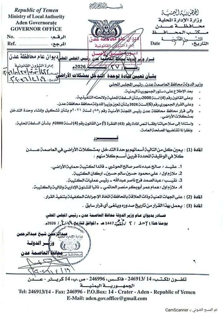 أصدر وزير الدولة محافظ العاصمة عدن عبدالرحمن شيخ، القرار رقم 27 لسنة 2026، بشأن تعيين قيادة لوحدة التدخل بمشكلات الأراضي.