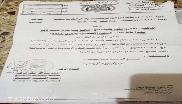 يكلف صائب عبدالعزيز سعيد ناشر مديرا عاما لمكتب الشؤون الاجتماعية والعمل بمحافظة لحج .