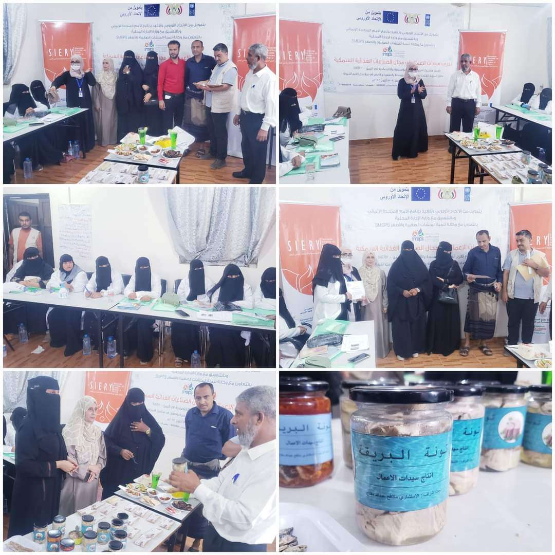 اختتمت اليوم " الخميس " بمديرية البريقة في العاصمة عدن، دورة تدريبية لسيدات الأعمال في مجال الصناعات الغذائية السمكية، ضمن مشروع ( SlERY ) بتمويل من الاتحاد الأوروبي وتنفيذ برنامج الأمم المتحدة الإنمائي بالتعاون مع وكالة تنمية المنشآت الصغيرة والمتوسطة.