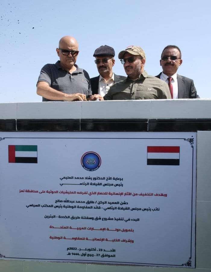 دشن العميد الركن طارق محمد عبدالله صالح عضو مجلس القيادة الرئاسي ومعه محافظ محافظة تعز نبيل شمسان اليوم البدء بتنفيذ مشروع طريق الكدحة - البيرين الذي يربط مدينة تعز بمديرية المخأ.