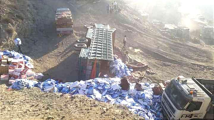 وقالت مصادر محلية إن حادث انقلاب الشاحنة ناتج عن السرعة الزائدة واختلال عجلة القيادة في يد السائق.