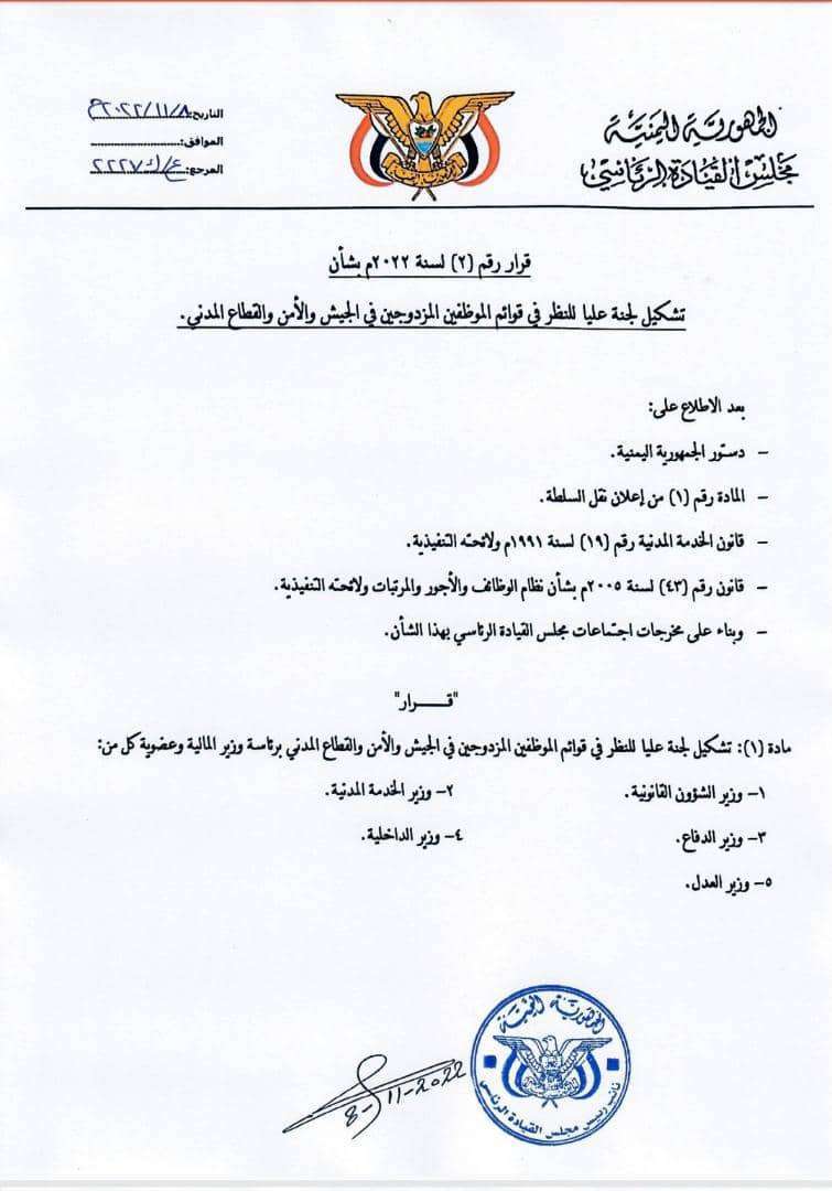 القرار قضى بتشكيل لجنة للنظر في قوائم الموظفين المزدوجين في الجيش والأمن والقطاع المدني برئاسة وزير المالية وعضوية كلٍ من :- وزير الشؤون القانونية ، ووزير المالية ، ووزير الدفاع ، وويزر الداخلية ، ووزير العدل.
