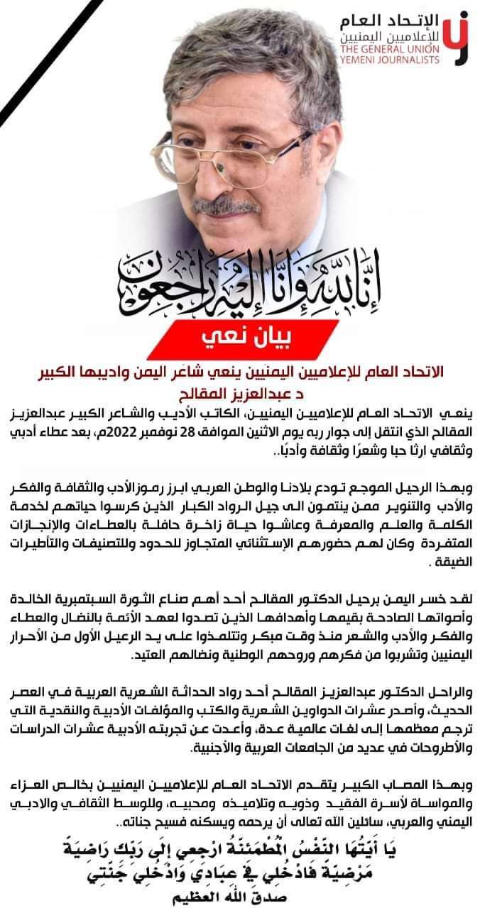 وبهذا المصاب الكبير يتقدم الاتحاد العام للإعلاميين اليمنيين بخالص العزاء والمواساة لأسرة الفقيد وذويه وتلاميذه ومحبيه، وللوسط الثقافي والادبي اليمني والعربي، سائلين الله تعالى أن يرحمه ويسكنه فسيح جناته..