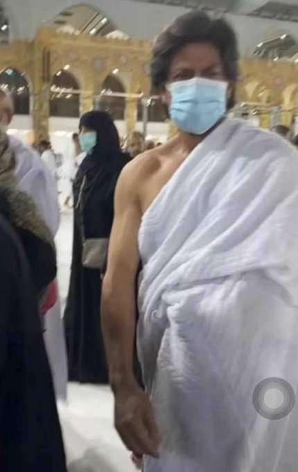 وظهر شاروخان في الصور المتداولة وهو يرتدي ملابس الإحرام، وقد أحاط به بعض الأشخاص.