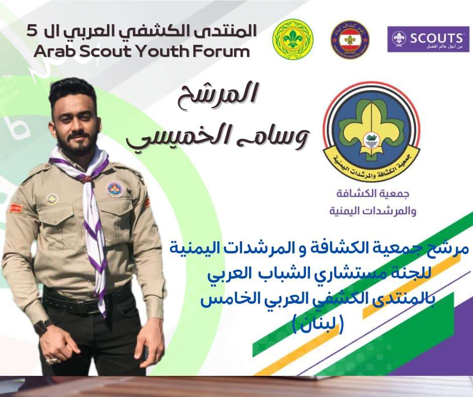 رشحت جمعية الكشافة والمرشدات اليمنية، المهندس وسام الخميسي لعضوية لجنة المستشارين الشباب العرب، ضمن المنظمة الكشفية العربية - الإقليم الكشفي العربي، والذين سيتم انتخابهم خلال المنتدى الكشفي العربي الخامس، الذي تنظمه لبنان افتراضيا .