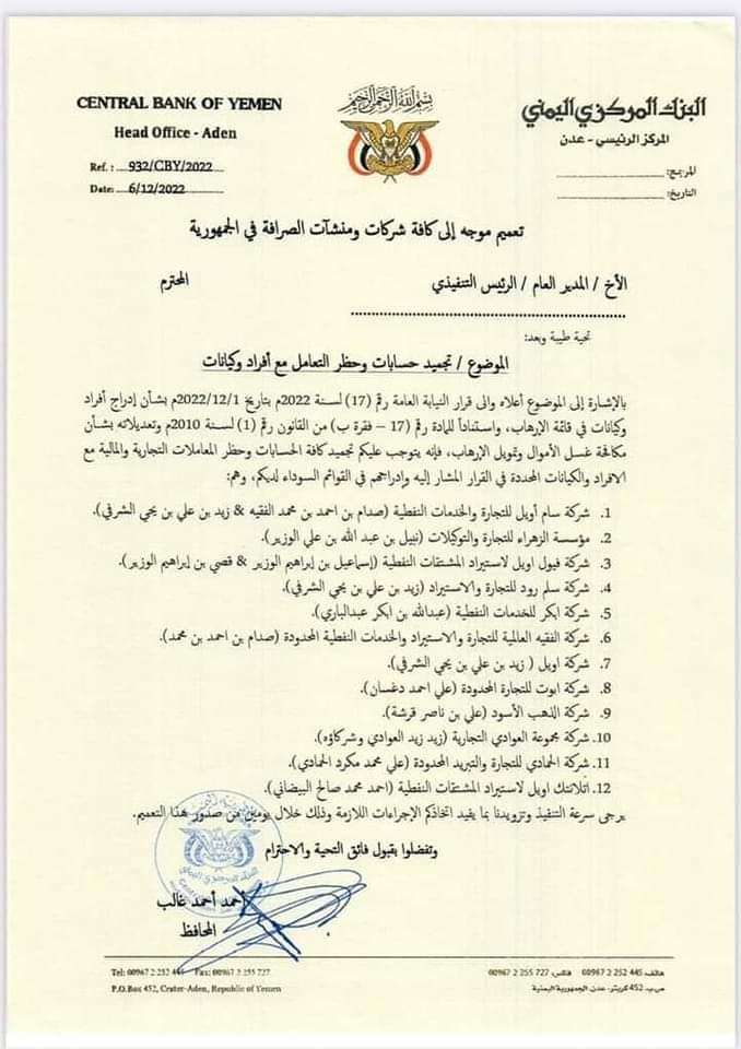 ووجه البنك المركزي اليمني تعميما إلى كافة شركات ومنشآت الصرافة في الجمهورية، لتجميد حسابات وحظر التعامل مع أفراد وكيانات ، في قائمة الإرهاب ، وهم :