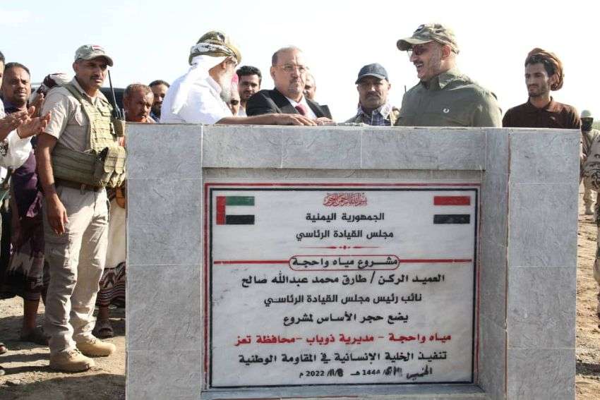 وضع عضو مجلس القيادة الرئاسي العميد الركن طارق محمد عبدالله صالح، اليوم الخميس، ومعه رئيس مجلس النواب الشيخ سلطان البركاني، حجر الأساس لمشروعي مياه الشرب في مديرية ذو باب المندب بمحافظة تعز.