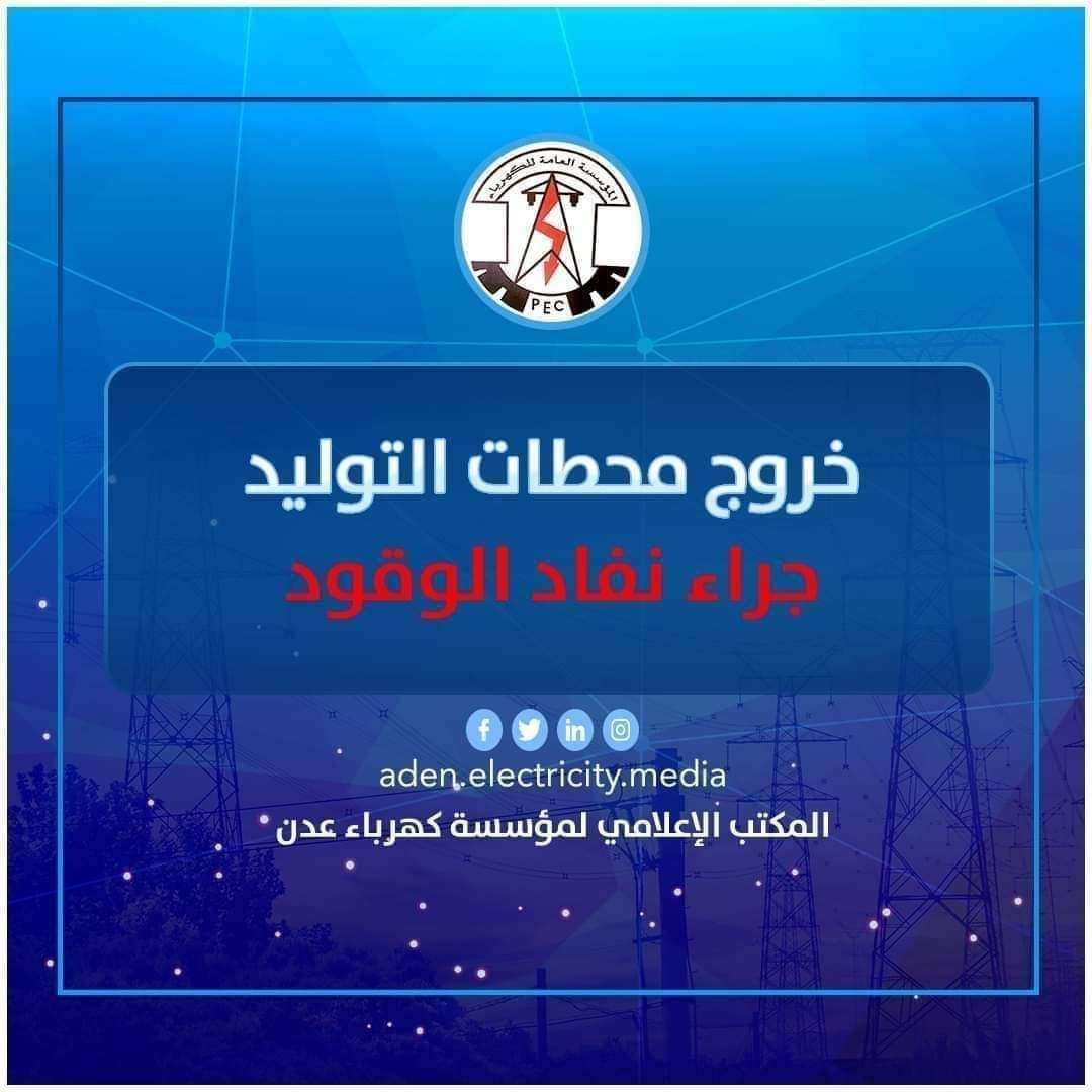 اعلنت المؤسسة العامة لكهرباء عدن، اليوم الخميس، عن بدء الخروج التدريجي لعدد من محطات التوليد بسبب نفاد وقود الديزل.