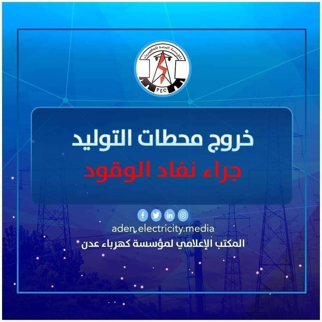 حذرت مؤسسة الكهرباء من دخول العاصمة عدن في ظلام دامس جراء نفاد الوقود.