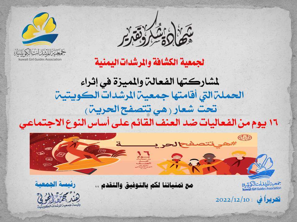 شاركت جمعية الكشافة والمرشدات اليمنية ضمن حملة "هي تتصفح الحرية" التي أقامتها جمعية المرشدات الكويتية، للتوعية حول العنف القائم على النوع الاجتماعي و بالتزامن مع ١٦ يوم لمناهضة العنف ضد المرأة.