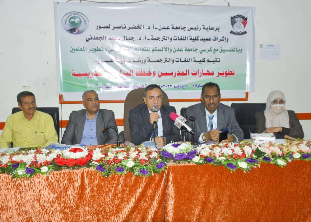 دشن الدكتور/ الخضر ناصر لصور رئيس جامعة عدن اليوم افتتاح الورشة العلمية التي تنظمها كلية اللغات بجامعة عدن بالتنسيق مع كرسي جامعة عدن و الألسكو للتعليم الإلكتروني و تطوير المعلمين بعنوان ( تطوير مهارات المدرسين و خطط البرامج التدريبية ) والتي تهدف إلى تطوير مهارات أعضاء الهيئة التدريسية ومراجعة مفردات المساقات الدراسية وتحديثها بمشاركة واسعة لأعضاء هيئة التدريس في الكلية .