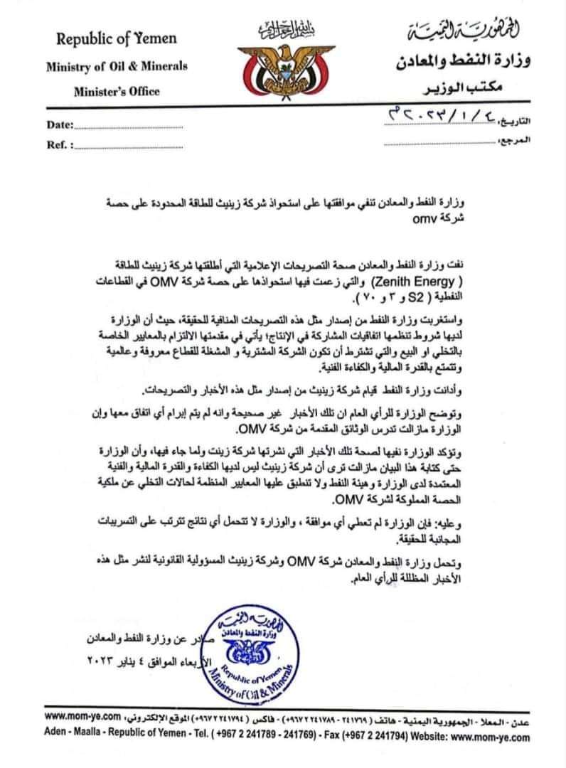 ونفت الوزارة في بيان صادر عنها تلقت وكالة الأنباء اليمنية (سبأ) نسخة منه، صحة تلك المزاعم والتصريحات الإعلامية التي أطلقتها شركة زينيث، حيث لم يتم إبرام أي اتفاق معها وأن وزارة النفط ما زالت تدرس الوثائق المقدمة من شركة (OMV) .. مستغربة إصدار شركة زينيث مثل هذه التصريحات المنافية للحقيقة .. محملة الشركتين مسؤولية نشر مثل هذه الأخبار المضللة للرأي العام..