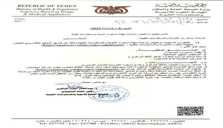 وطالبت الهيئة في التعميم الذي تلقته وكالة الأنباء اليمنية (سبأ) من جميع المستوردين سرعة تجديد تراخيصهم عبر الموقع الاليكتروني الخاص بالهيئة العليا للأدوية والمستلزمات الطبية (https://egateway_ysbda.com/e_submissiop).