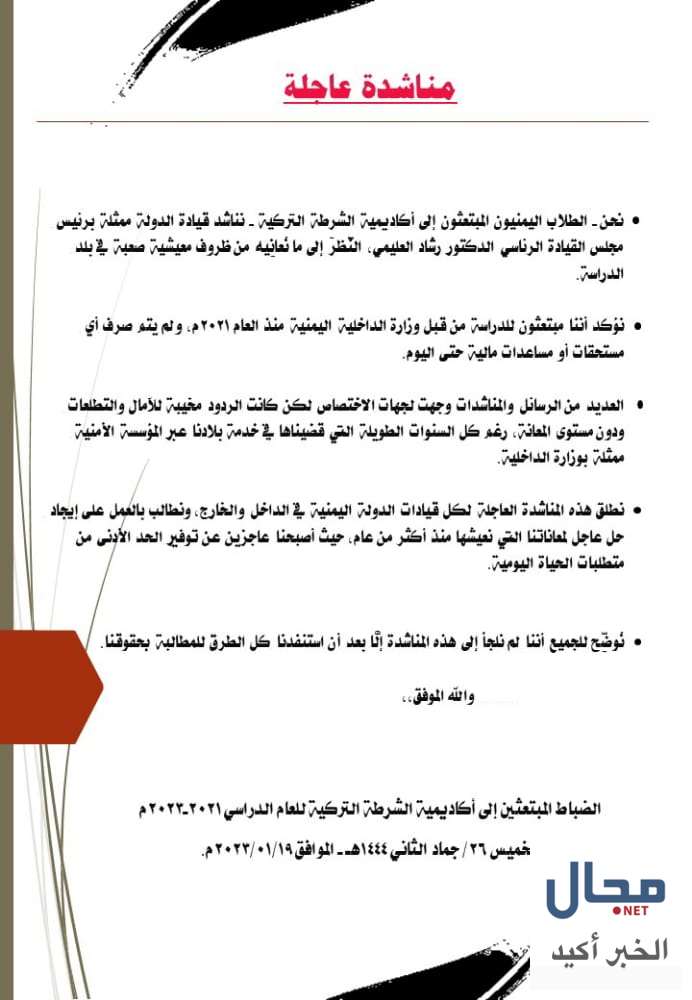 ناشد الطلاب اليمنيين المبتعثين في اكاديمية الشرطة التركية رئيس الجمهورية والمجلس الرئاسي وكافة الجهات المعنيه بصرف مستحقاتهم الدراسية كؤنهم لما يستلموا مستحقات أو مساعدات مالية منذ ابتعاثهم.