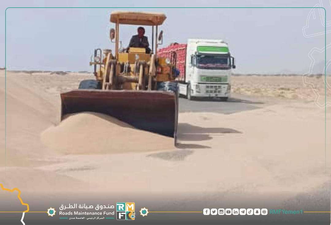 وتجري الأعمال هناك بتمويل واشراف من صندوق صيانة الطرق والجسور المركز الرئيسي بالعاصمة عدن بجهود كبيرة من الفرق الفنية لإزاحة الرمال من الخط للحد من وقوع الحوادث المرورية التي يتعرض لها المواطنين بسبب الرمال الزاحفة على جسم الطريق.