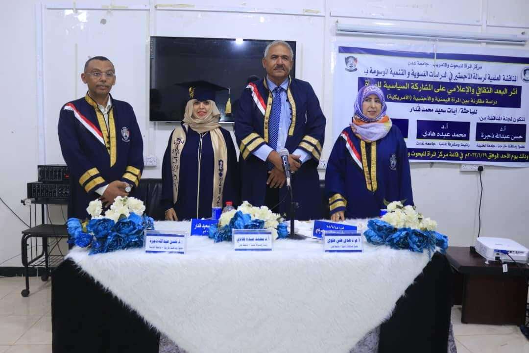 وخلال مناقشة الرسالة التي تمت في مركز المرأة للبحوث والتدريب - جامعة عدن ، استعرضت الباحثة آيات سعيد قدار ، اهداف ومحتويات الرسالة والتوصيات النهائية و التي استنتجتها بعد سنوات من جمع المعلومات عبر المراجع المحلية والاجنبية ونتائج الاستبيان ، نالت استحسان لجنة المناقشة والحضور .