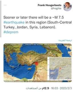 وافاد الباحث الهولندي فرانك هوجربيتس بحدوث الزلازال التي ضربت اليوم تركيا ولبنان سوريا قبل 3 أيام من وقوعها.