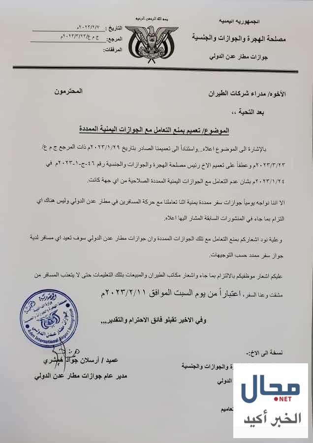 أصدرت جوازات مطار عدن الدولي تعميما لشركات الطيران بوقف التعامل مع الجوازات الممددة.