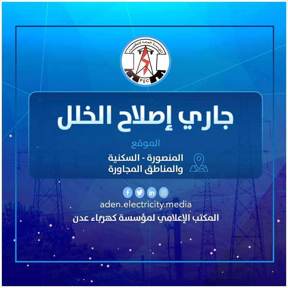 وبهذا الصدد تعبر المؤسسة العامة لكهرباء عدن عن بالغ أسفها لهذا الخلل الخارج عن إرادتها.