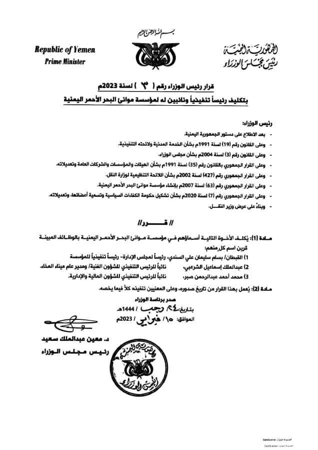 أصدر دولة رئيس مجلس الوزراء قرار رقم (٣) لسنة٢٠٢٣م ، و بناءاً على عرض معالي وزير النقل قضى: بتكليف رئيسا تنفيذيا ونائبين له لمؤسسة موانىء البحر الأحمر اليمنية على النحو الآتي: