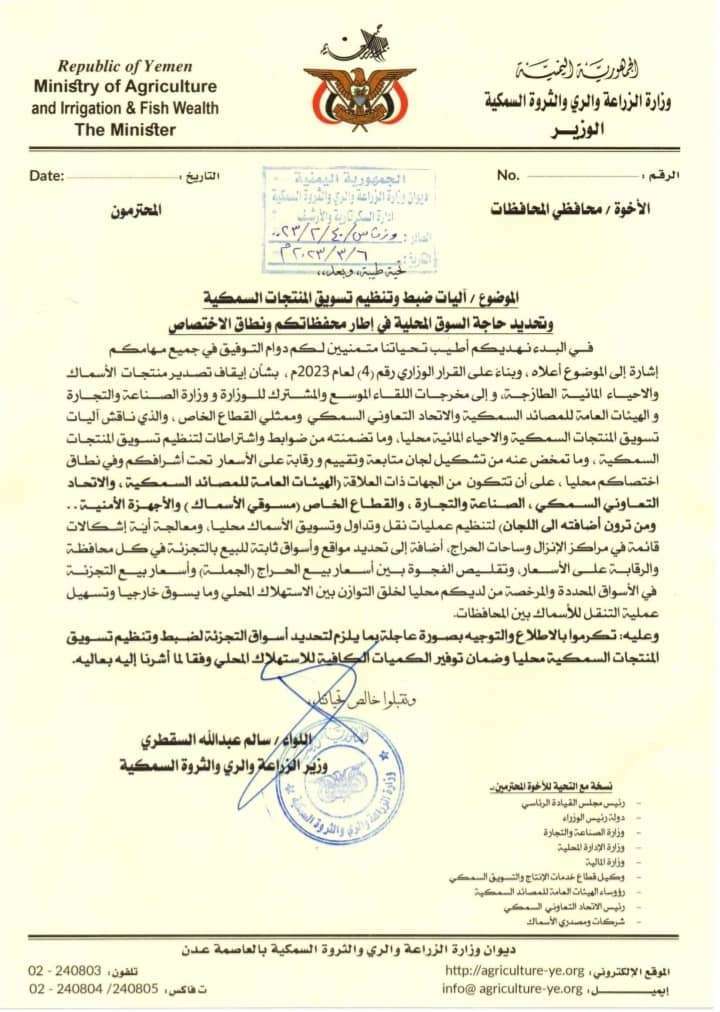 أصدرت وزارة الزراعة والري والثروة السمكية مذكرة رسمية إلى محافظي المحافظات أشارت فيها إلى تحديد أسواق ثابتة لبيع الأسماك بالتجزئة في كل محافظة وذلك لضبط وتنظيم تسويق المنتجات السمكية محلياً وضمان توفير الكميات الكافية للاستهلاك المحلي.