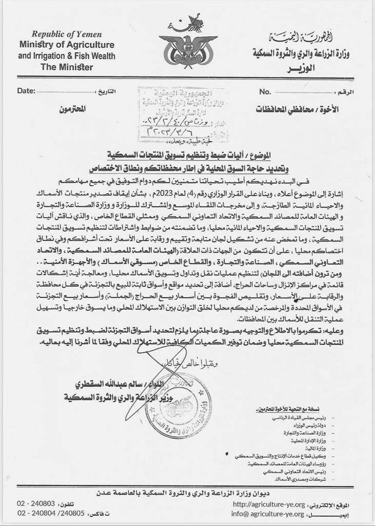 خاطبت وزارة الزراعة والري والثروة السمكية عبر مذكرة رسمية إلى محافظي المحافظات أشارت فيها إلى تحديد أسواق ثابتة لبيع الأسماك بالتجزئة في كل محافظة وذلك لضبط وتنظيم تسويق المنتجات السمكية محلياً وضمان توفير الكميات الكافية للاستهلاك المحلي.