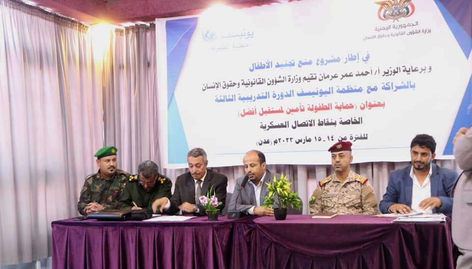 اختتمت اليوم، في العاصمة عدن، الدورة التدريبية الثالثة التي اقامتها وزارة الشؤون القانونية وحقوق الإنسان، بالشراكة مع منظمة اليونيسيف، تحت عنوان (حماية الطفولة تأمين لمستقبل أفضل) والتي اقيمت على مدى يومي 14_15من مارس، ومشاركة الحزام الأمني ومندوبي الوحدات العسكرية في وزراتي الدفاع والداخلية والعمالقة الجنوبية والقوات المشتركة في الساحل الغربي.