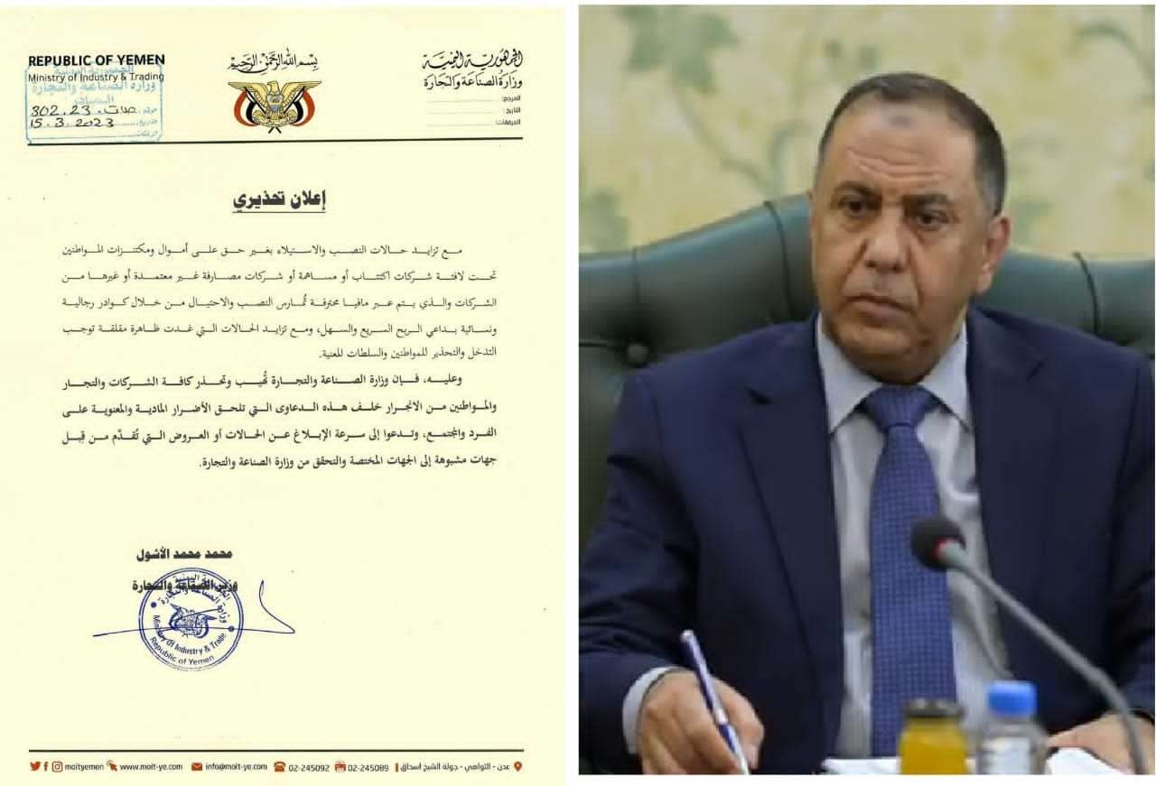 أصدرت وزير الصناعة والتجارة الاستاذ محمد الاشول، أعلان تحذيري لكافة الشركات والتجار والمواطنين من الإنجرار خلف الدعاوى التي تلحق الأضرار المادية والمعنوية على الفرد والمجتمع.