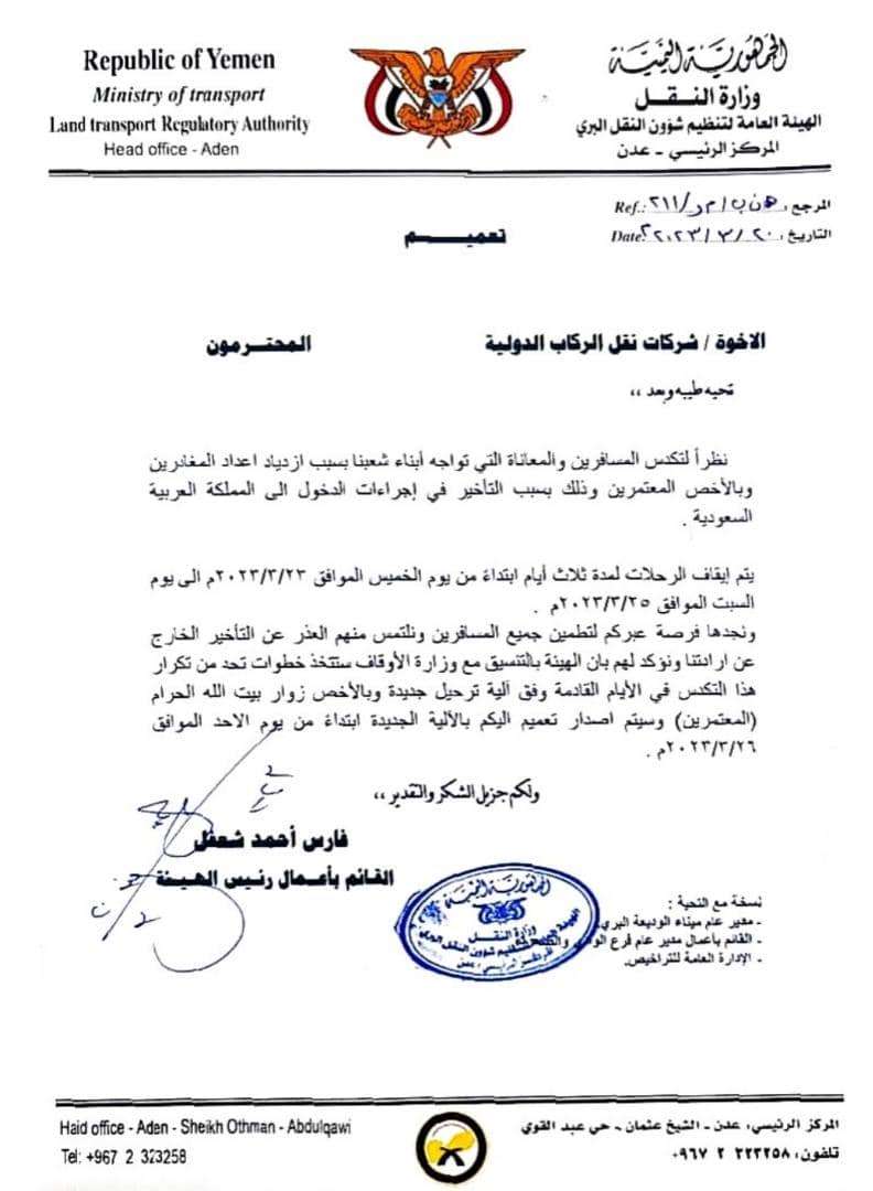 أعلنت الهيئة العامة لتنظيم شؤون النقل البري اليوم الاثنين، ايقاف الرحلات الدولية لمدة ثلاثة ايام ابتداء من الخميس القادم ٢٣ /٣/ ٢٠٢٣ م وحتى يوم السبت الموافق ٢٥/ ٣ / ٢٠٢٣م بسبب تكدس المسافرين في ميناء الوديعة والعبر وذلك بسبب التأخير في إجراءات الدخول إلى المملكة العربية السعودية.