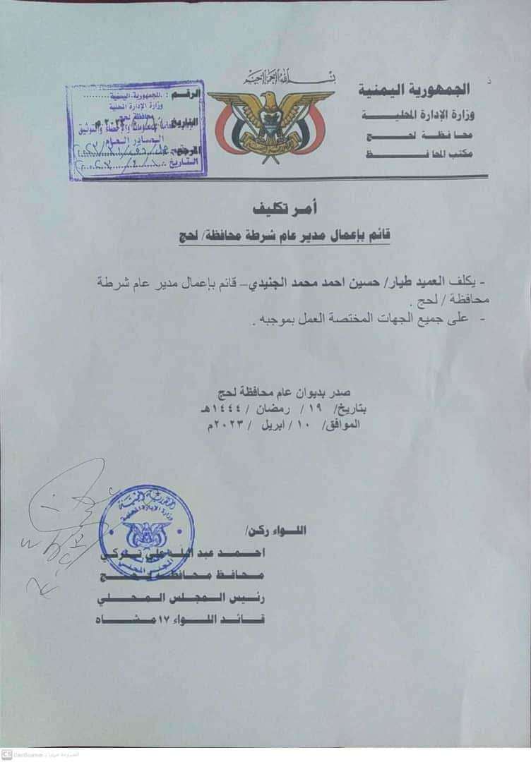 يكلف العميد طيار/حسين احمد محمد الجنيدي قائم باعمال مدير عام شرطة محافظة لحج، وعلى جميع الجهات المختصة العمل بموجبه.