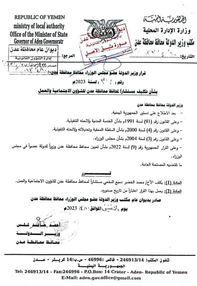 أصدر معالي وزير الدولة، محافظ العاصمة عدن الأستاذ أحمد حامد لملس، القرار رقم "37" لسنة 2023م، قضت مادته الأولى بتكليف الأخ/ محمد الخضر دمبع النخعي مستشارا لمحافظ عدن للشؤون الاجتماعية والعمل.