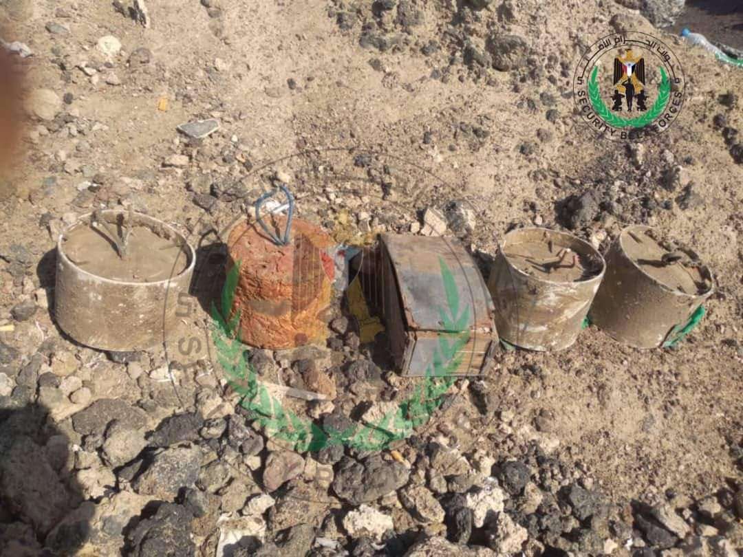 عثرت قوات الحزام الأمني ساحل محافظة أبين صباح الجمعة على عبوات ناسفة مرمية بأحد أودية الرملة والجبلية غرب مدينة شقرة بمحافظة أبين.