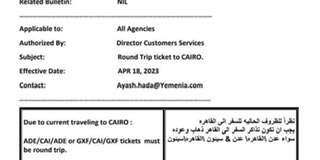 وافادت الخطوط اليمنية بانه نظرا للظروف الحالية للسفر الى القاهرة يجب ان تكون تذاكر السفر الى القاهرة ذهاب وعودة