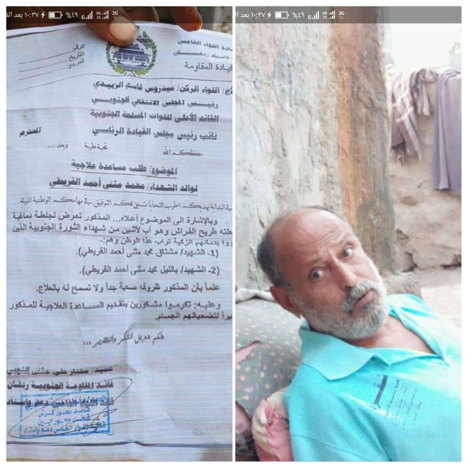 وبحسب احد اقرباء المريض انه سبق وان تم توجيه مناشدة سابقة للرئيس الزبيدي مختمة من قبل القائد مختار النوبي وقيادة المجلس الانتقالي والمشائخ بردفان لعلاج والد الشهداء الثلاثة " القريطي " بعد اصابته بجلطة